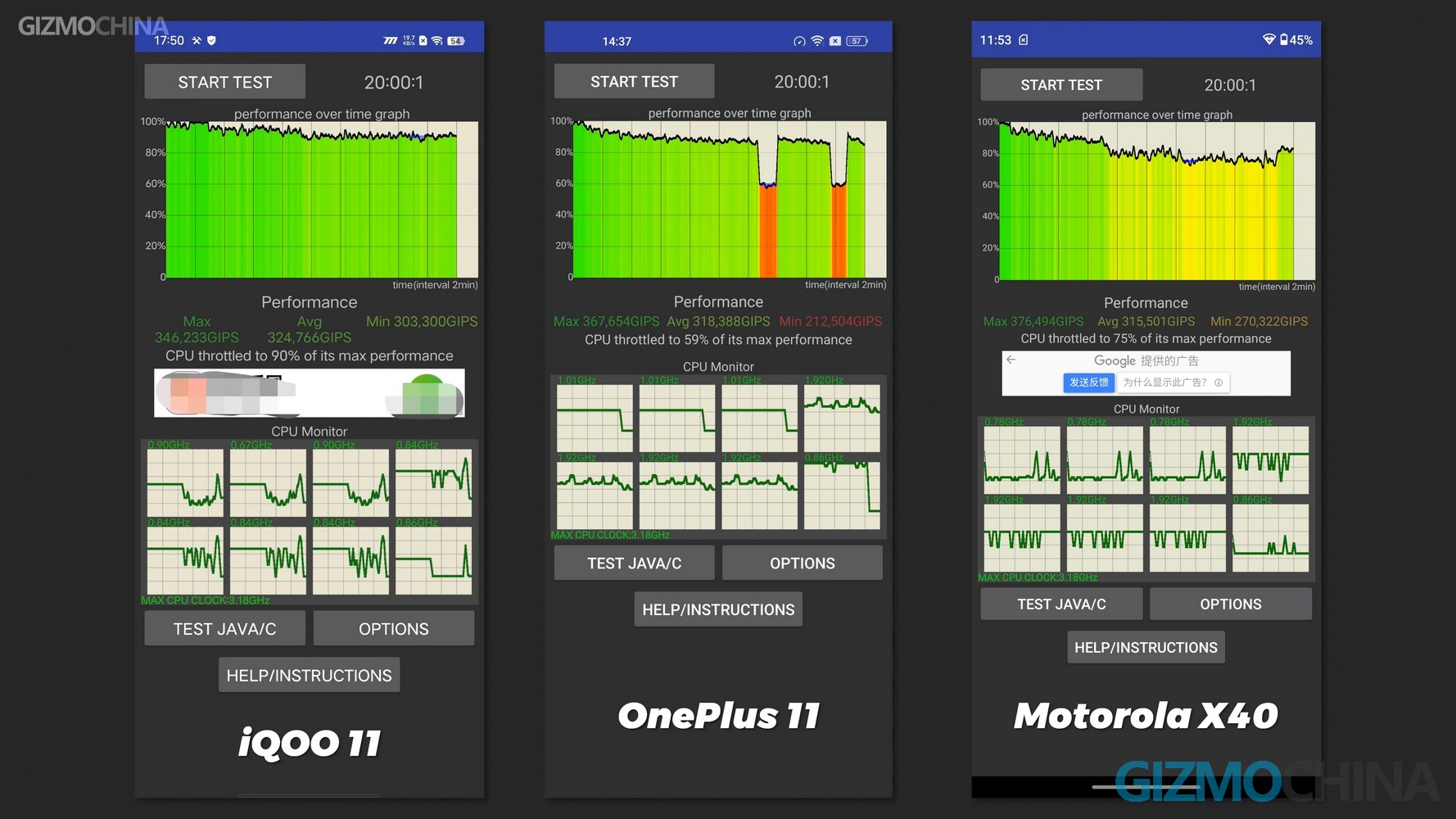 The performance of the OnePlus 11 is on the level of mainstream 8 Gen 2 phones, with no issues found on Benchmark. But the CPU throttling test results are a bit disappointing, OnePlus 11 is the only 8 Gen 2 phone we’ve tested that’s underclocked. The phone is only 47 degrees Celsius at this point, which isn’t particularly hot. Hey OnePlus, did you forget what it is written on your box?