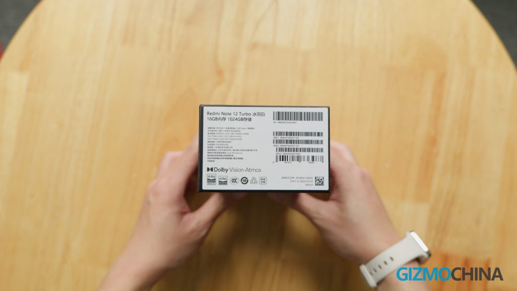 One of the marketing words for the Redmi Note 12 Turbo is magic, so we can see it wrapped in a black box with a mysterious feel. What we got is the white variant with insane 16GB memory and 1TB storage, which is one of the hottest-selling versions because it costs only $400! This is totally insane, and here we can also learn from the label that it supports Dolby Vision display as well as Dolby Atmos sound.